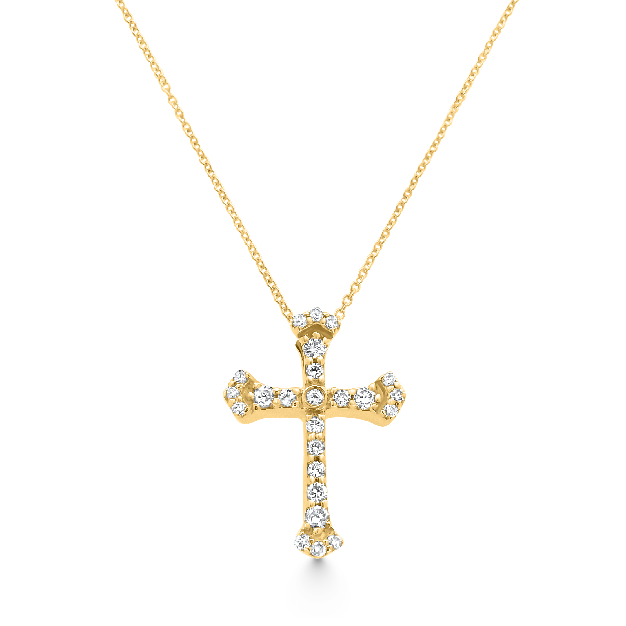 This exquisite cross pendant is crafted in radiant gold and adorned with brilliant diamonds along its elegant silhouette. The arms of the cross feature a gently flared design, with each tip accented by a cluster of sparkling diamonds for a regal touch. Suspended from a delicate gold chain, this pendant is a timeless symbol of faith and refinement.