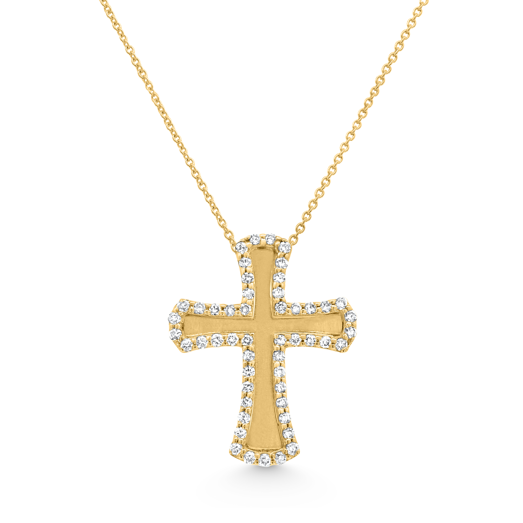This elegant cross pendant features a softly contoured silhouette, accentuated by a delicate halo of shimmering diamonds that trace its edges. The brushed gold finish at the center contrasts beautifully with the brilliance of the diamonds, creating a refined and timeless aesthetic. Suspended from a classic gold chain, this pendant is a striking expression of faith and luxury.