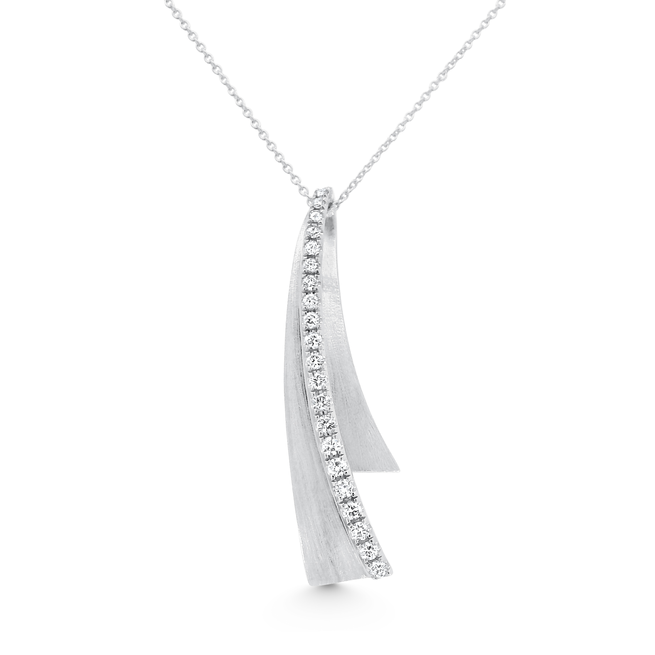 This pendant features an artistic, elongated gold design with a gracefully curved structure. A row of brilliant diamonds cascades along the edge, enhancing its dynamic movement. The brushed gold finish contrasts beautifully with the radiant sparkle, creating a modern yet timeless piece.