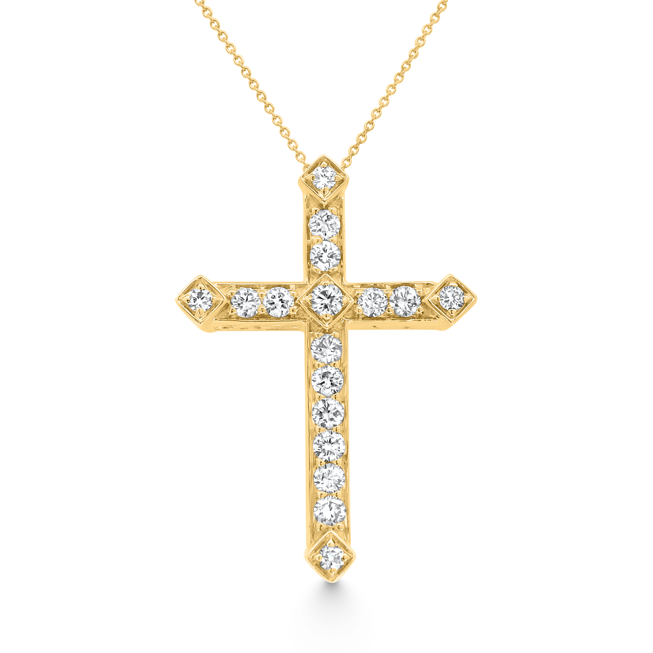 This striking cross pendant is crafted in radiant gold and adorned with a series of brilliant round diamonds. Each arm of the cross is meticulously set with sparkling stones, framed by elegant gold edges that add a refined geometric touch. Timeless and luminous, this piece embodies faith and sophistication in perfect harmony.