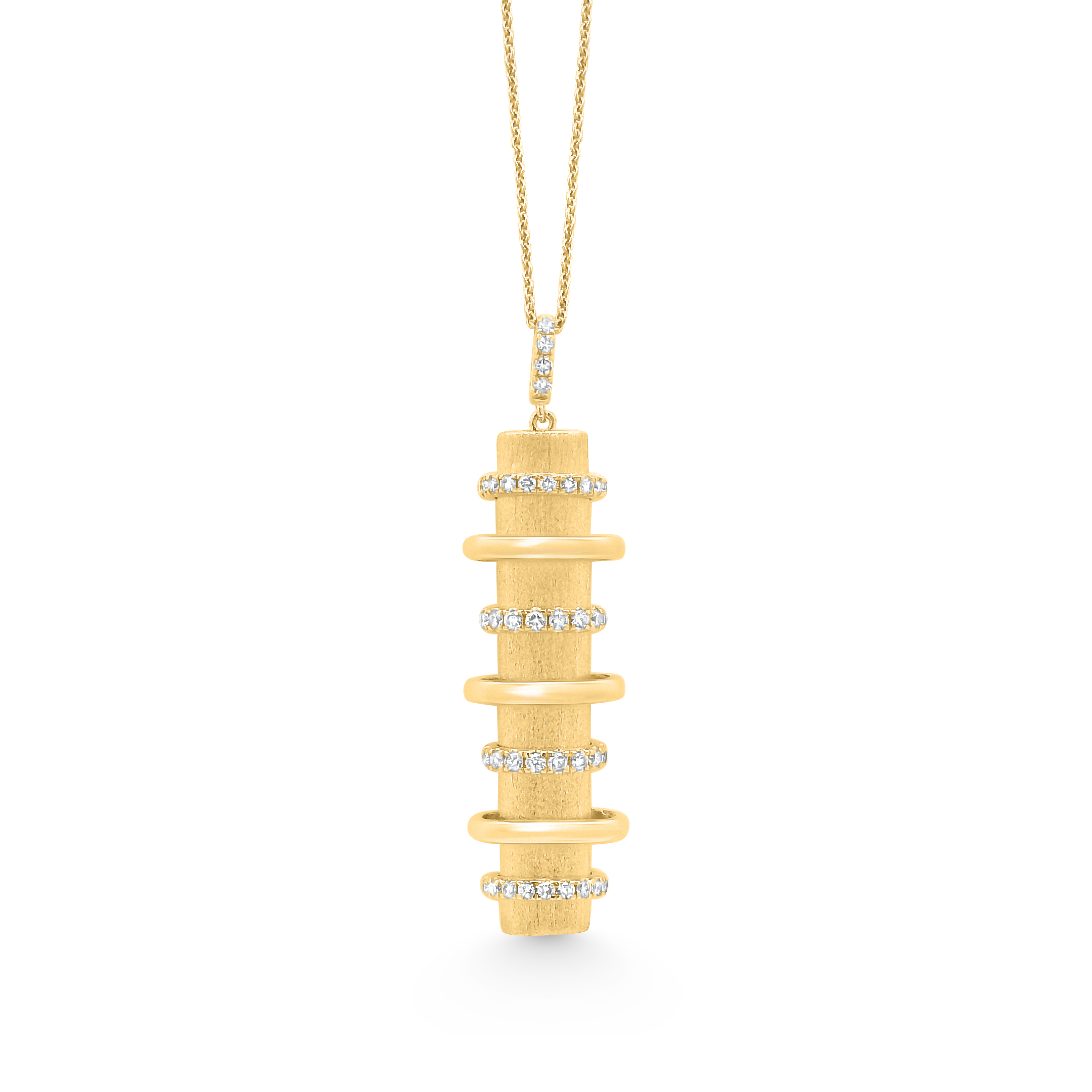 A bold yet refined 14K gold pendant, featuring luminous diamond-studded bands wrapped around a brushed gold column. A radiant fusion of texture and brilliance for timeless elegance.