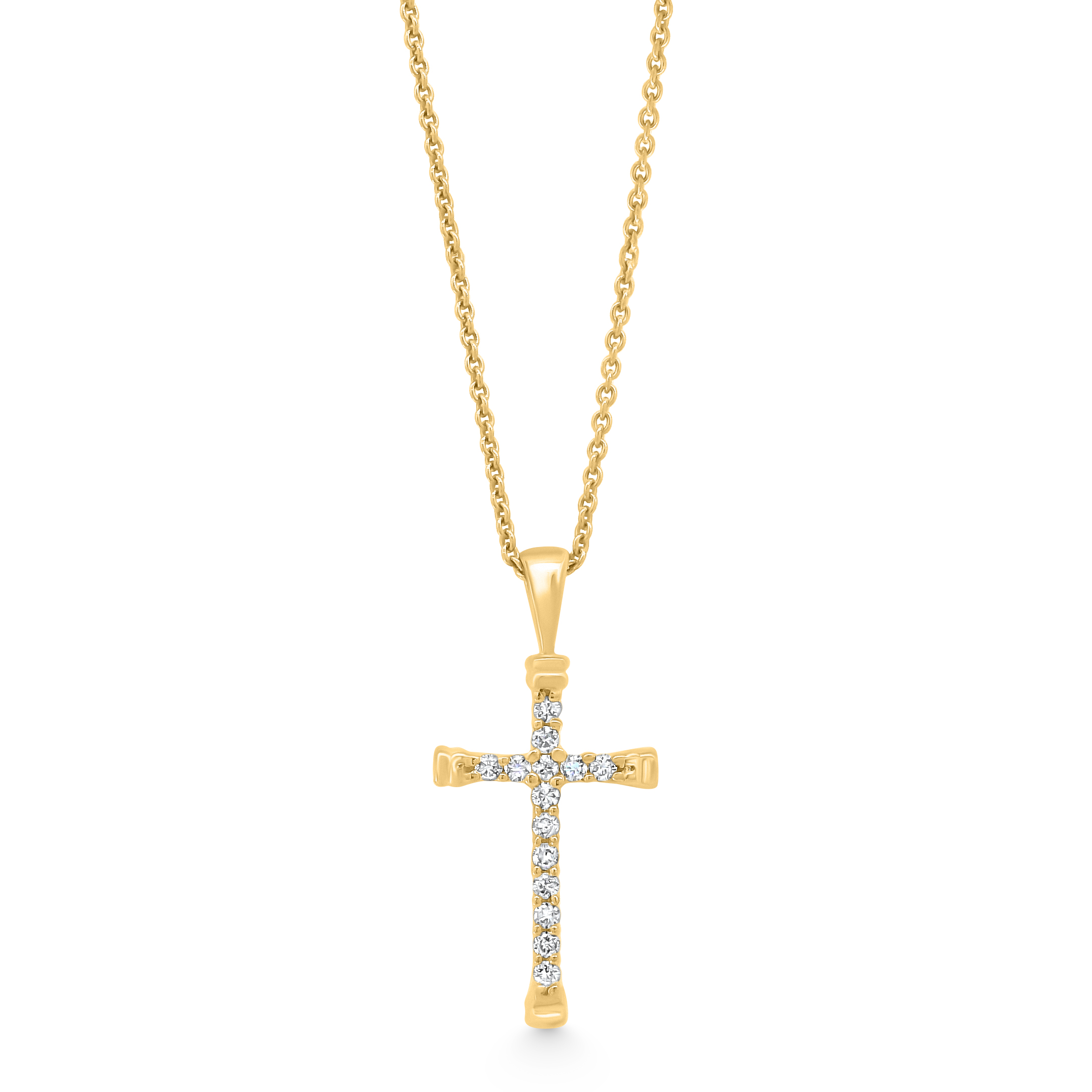 A classic 14K gold cross pendant, elegantly adorned with a row of sparkling round-cut diamonds, featuring subtle detailing at the ends for a refined and timeless expression of faith.