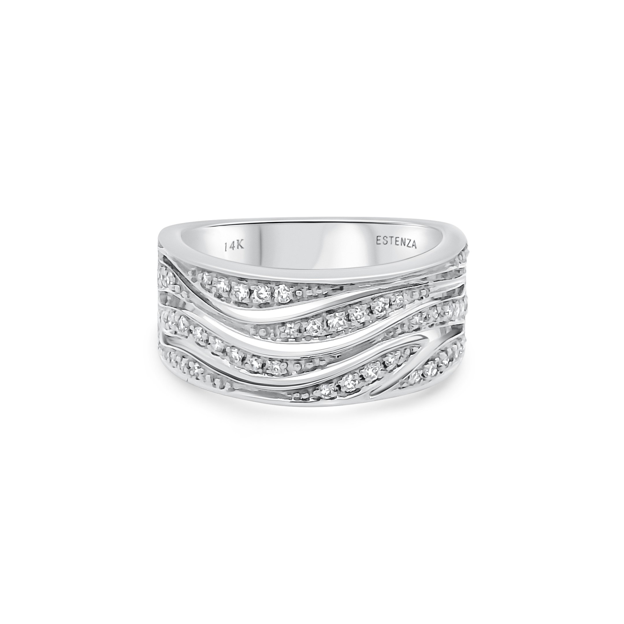 A striking 14K gold wide-band ring featuring an intricate wave-inspired design, adorned with brilliant round-cut diamonds flowing gracefully across the surface, creating a dynamic and elegant look.