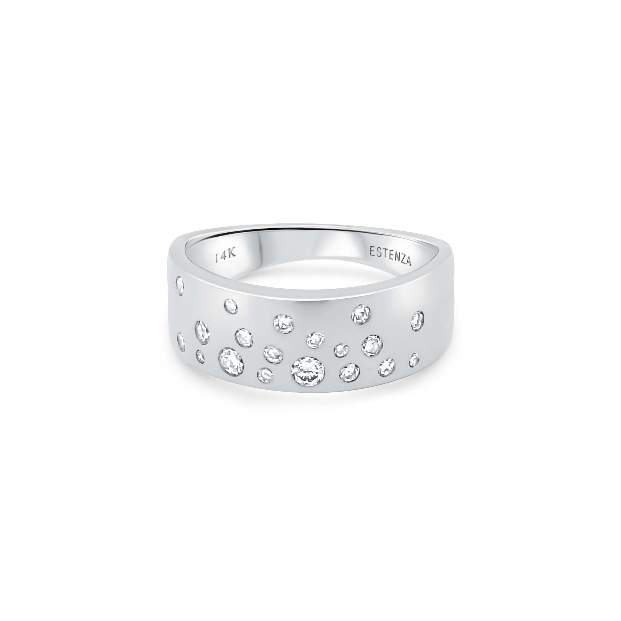 A contemporary 14K gold wide-band ring featuring a scattered array of bezel-set round diamonds, creating a mesmerizing starry effect that exudes modern elegance and sophistication.