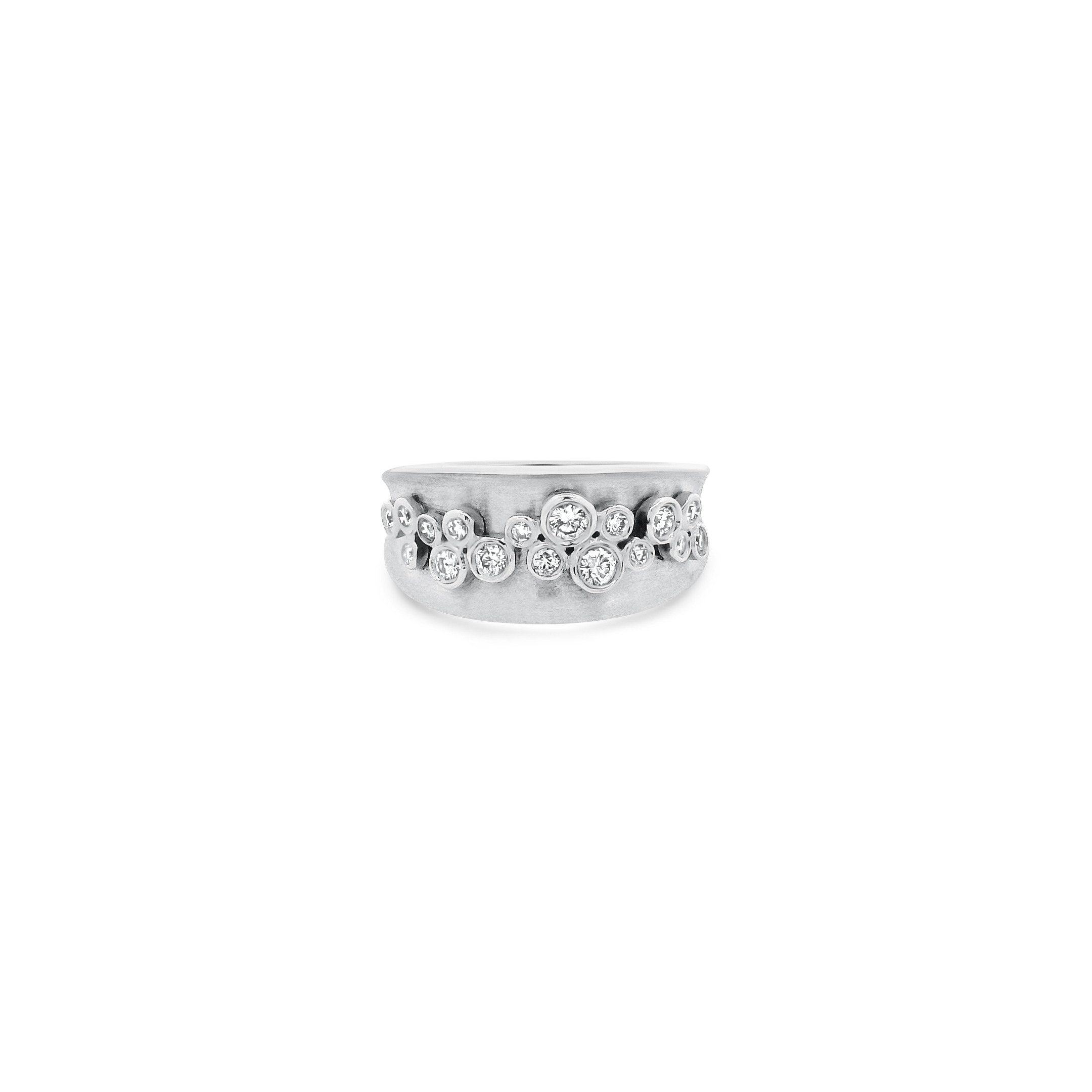 A bold 14K gold wide-band ring featuring a brushed finish, beautifully adorned with a cluster of bezel-set round diamonds in an organic, scattered arrangement, creating a celestial-inspired elegance.