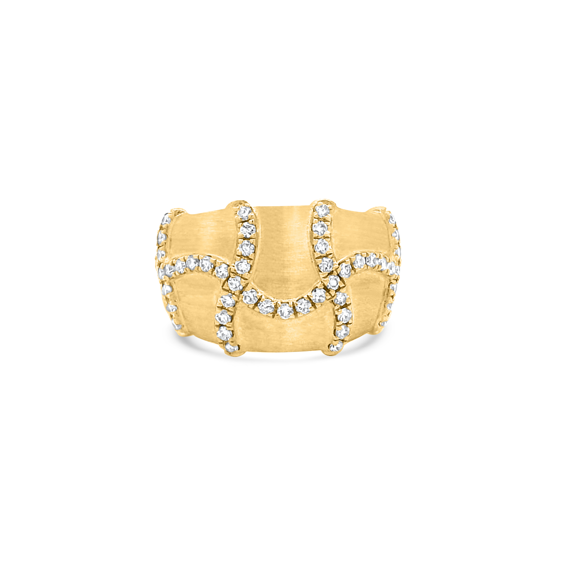 A captivating 14K gold wide-band ring featuring a luxurious brushed finish, elegantly intersected by delicate diamond-encrusted curves, creating a mesmerizing lattice-like design that exudes sophistication and brilliance.